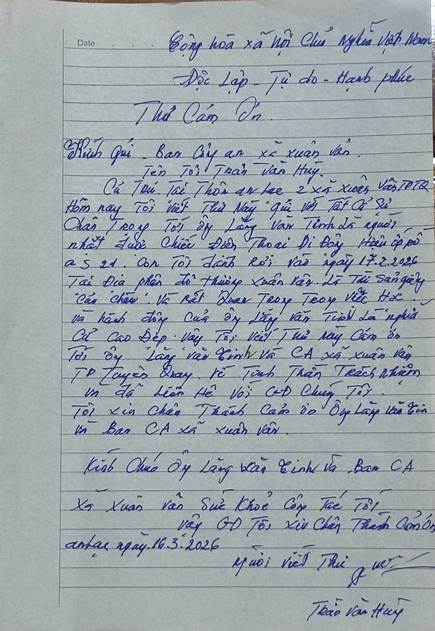 Công an xã Xuân Vân trân trọng biểu dương tinh thần, nghĩa cử cao đẹp của anh Lăng Văn Tin; đồng thời mong muốn trong thời gian tới sẽ tiếp tục tiếp nhận, lan tỏa nhiều hơn nữa những tấm gương “Người tốt, việc tốt”, chung tay xây dựng môi trường sống văn minh, an toàn, nghĩa tình