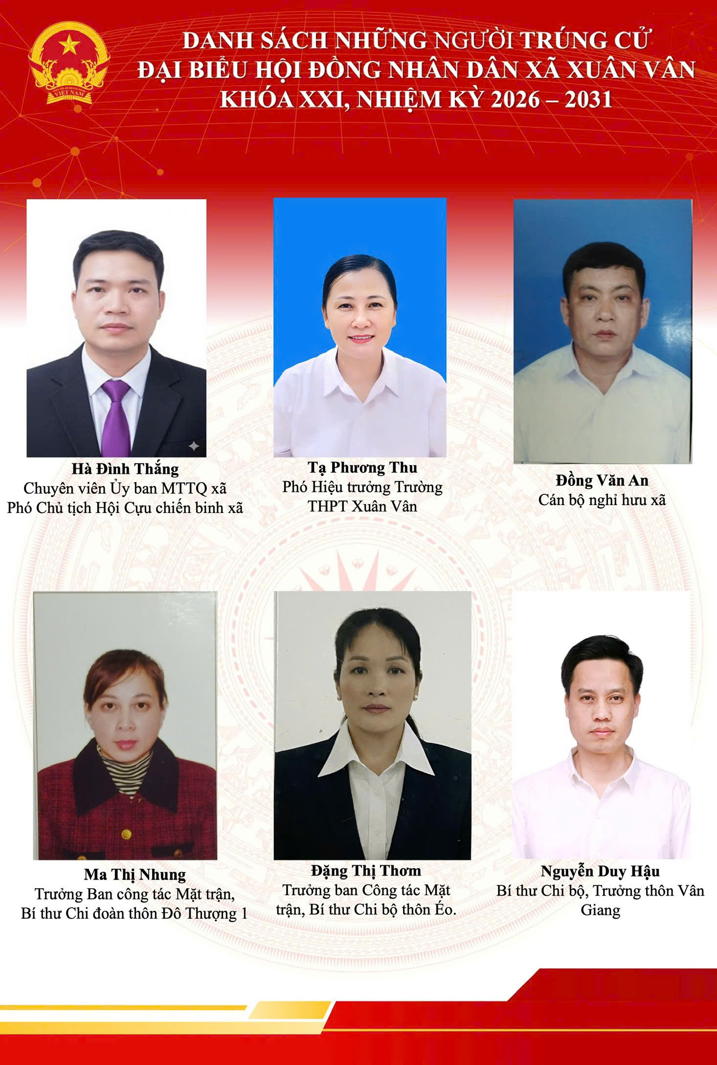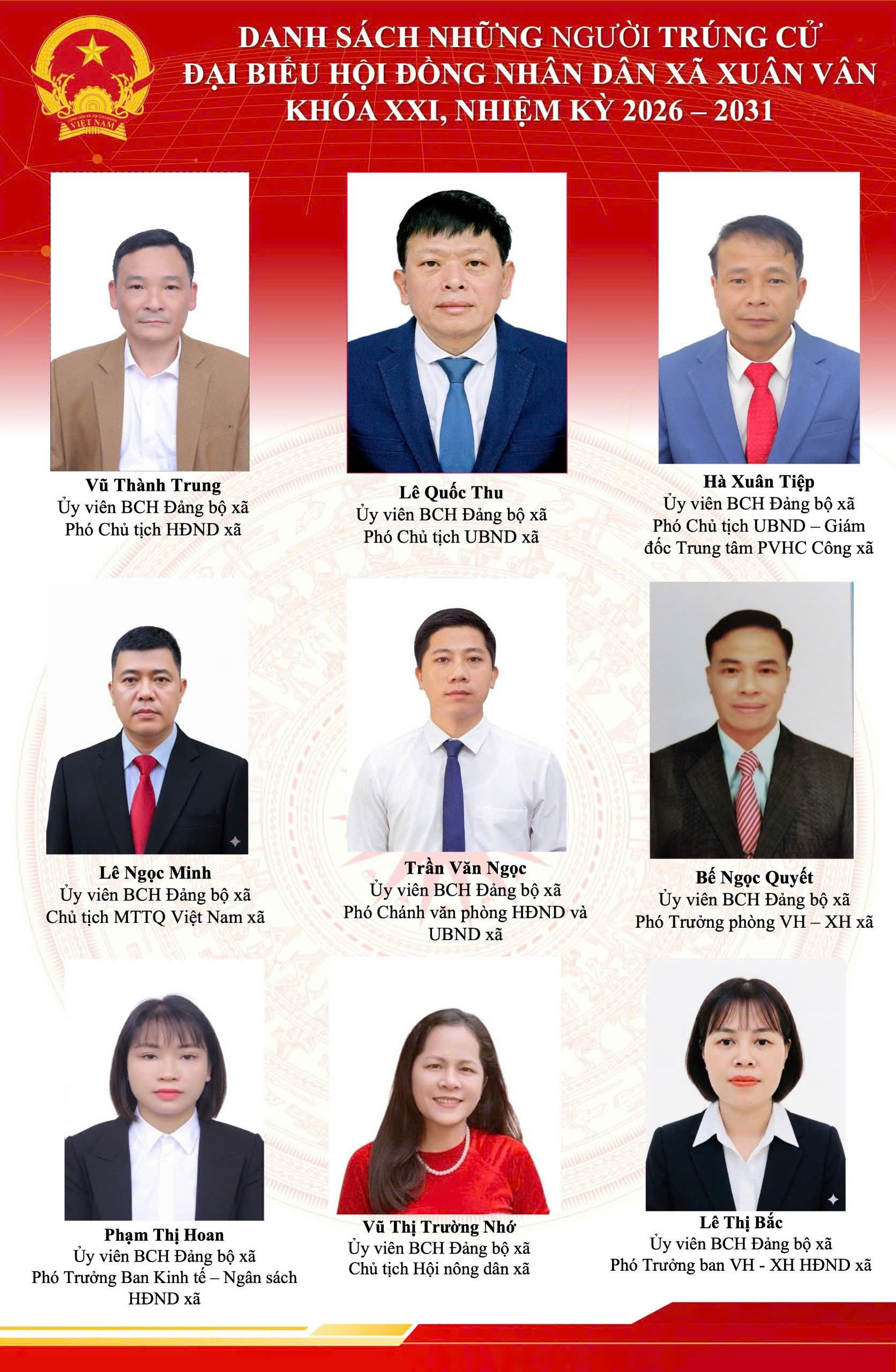 Đây là những đồng chí tiêu biểu về phẩm chất chính trị, đạo đức, năng lực và uy tín, đại diện cho ý chí, nguyện vọng và quyền làm chủ của Nhân dân xã Xuân Vân.