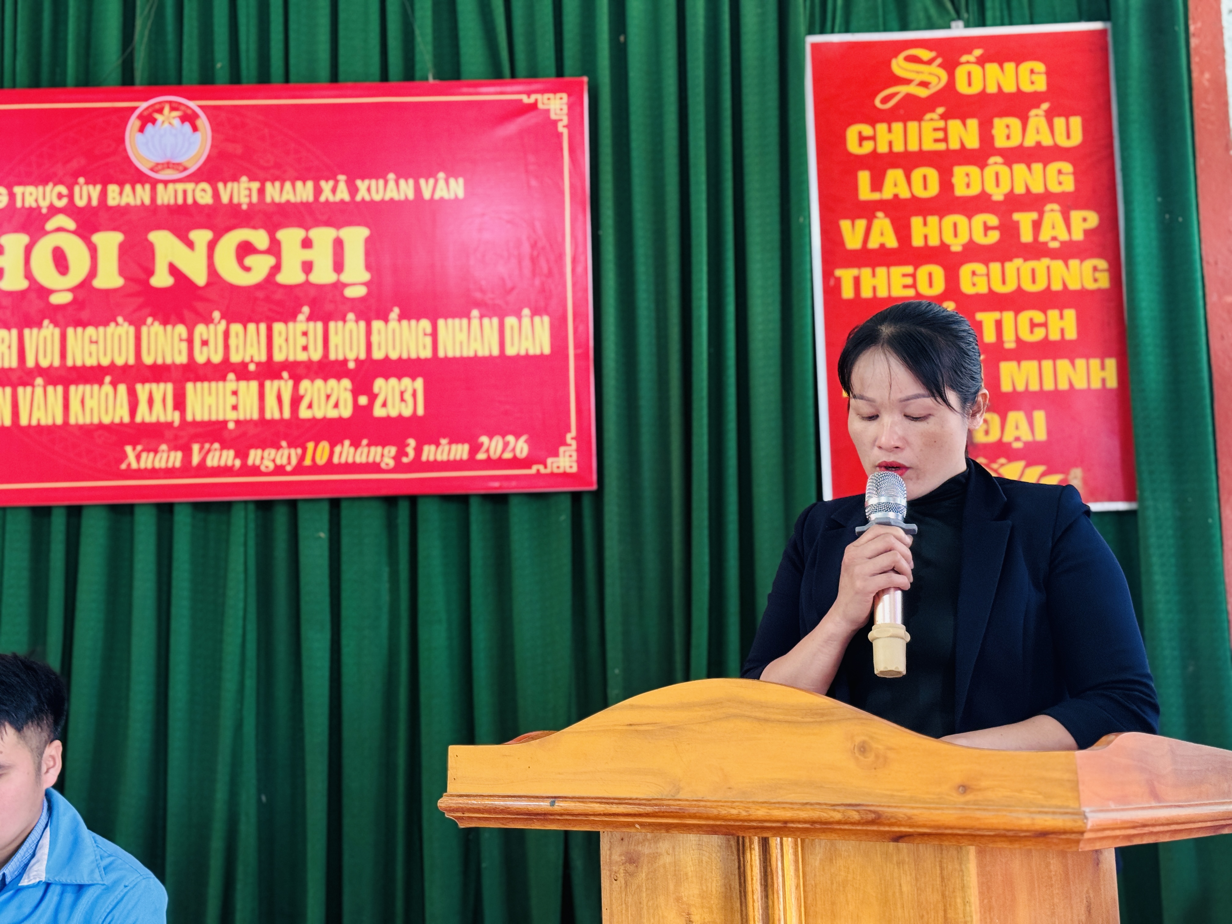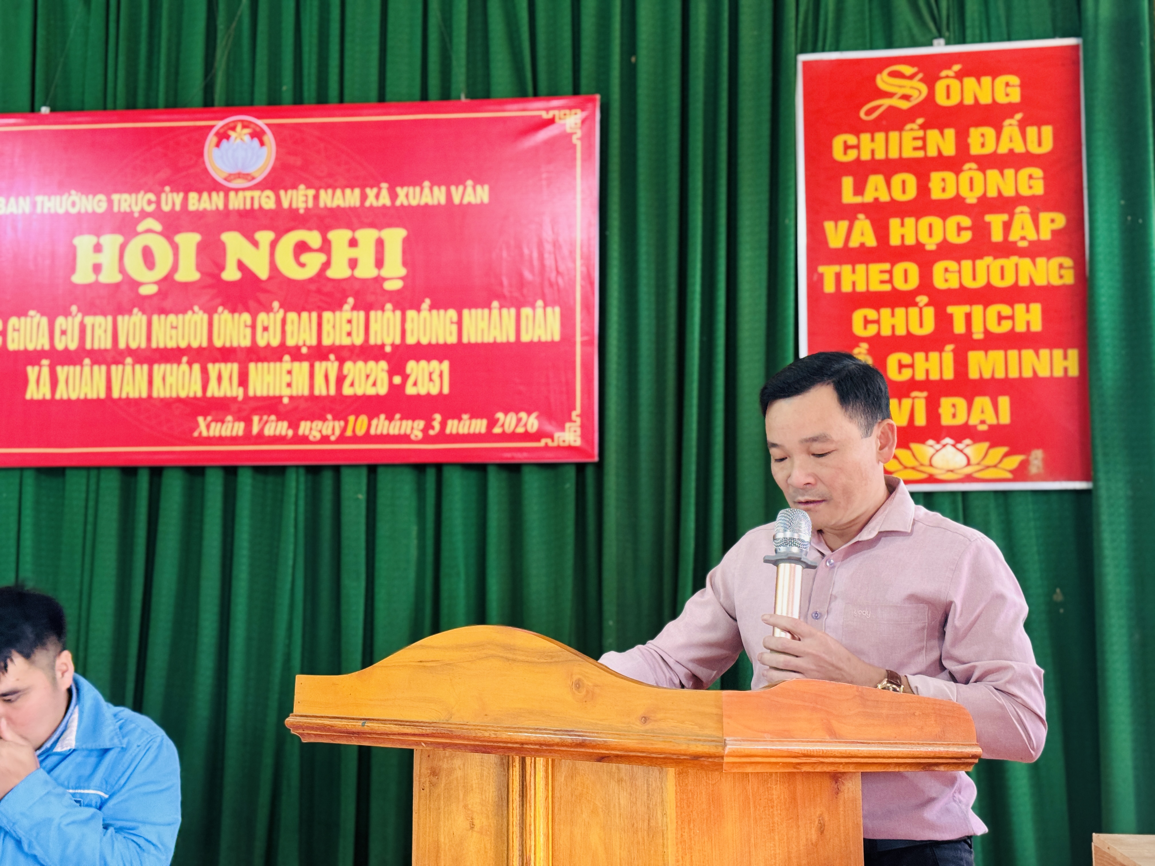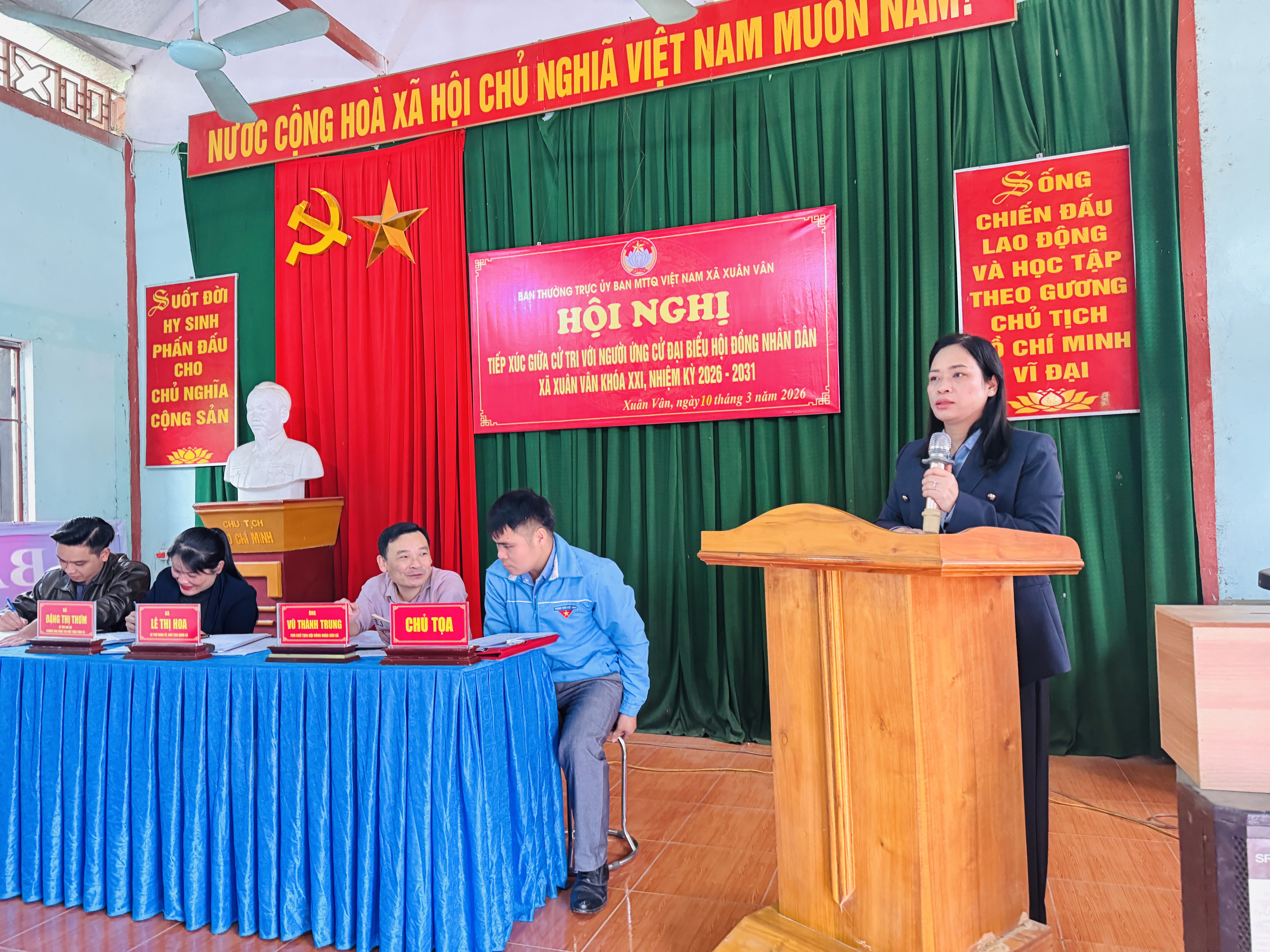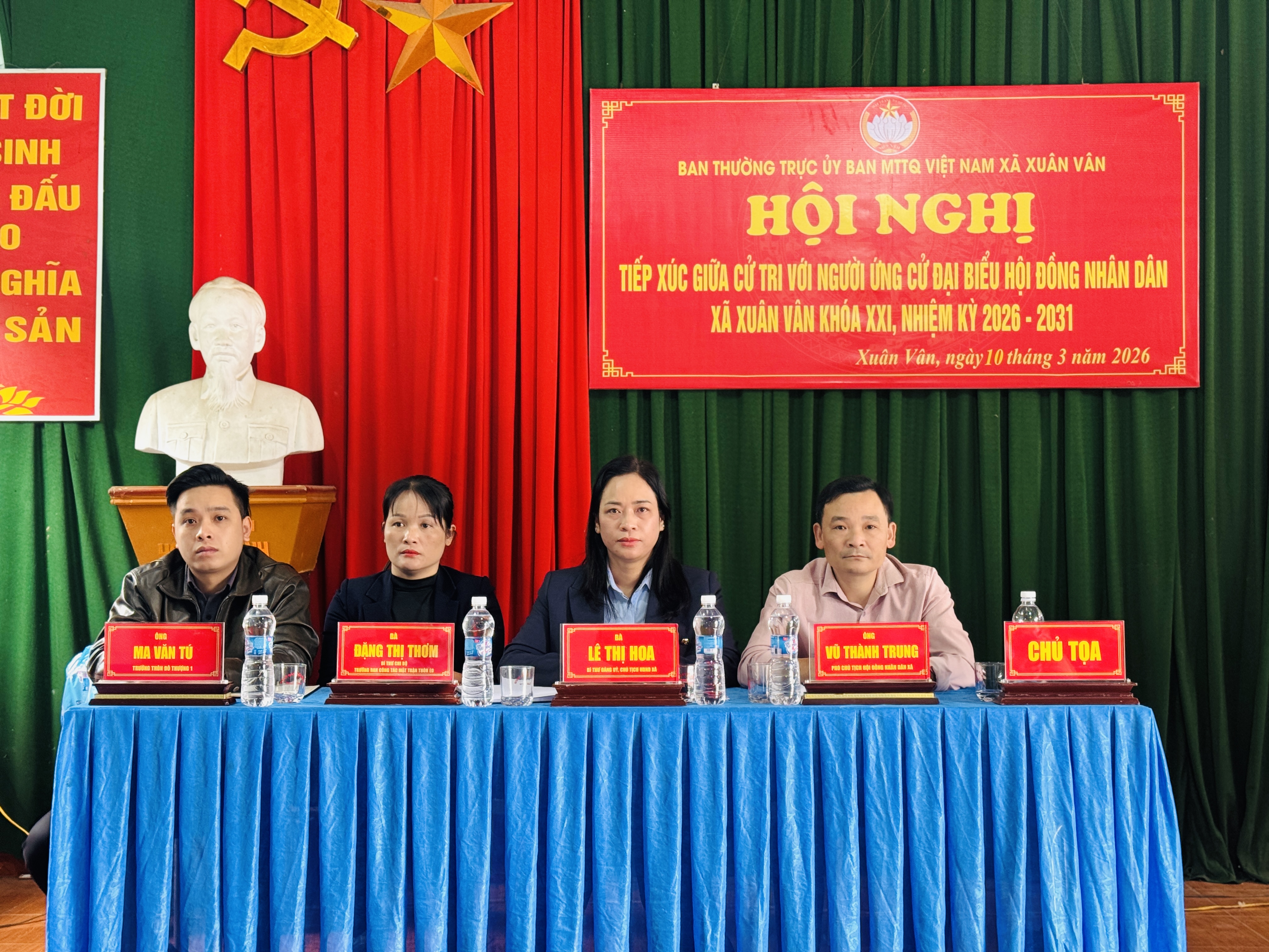Hội nghị diễn ra trong không khí dân chủ, thẳng thắn với sự tham dự đông đảo của cử tri trên địa bàn. Hội nghị do đồng chí Hà Tiến Minh – Ủy viên Ban Chấp hành Đảng bộ xã, Phó Chủ tịch Ủy ban Mặt trận Tổ quốc Việt Nam xã, Bí thư Đoàn Thanh niên xã Xuân Vân chủ trì. Tại hội nghị, cử tri đã được nghe đại diện Ủy ban MTTQ Việt Nam xã Xuân Vân giới thiệu tiểu sử tóm tắt của 5 ứng cử viên đại biểu HĐND xã Xuân Vân nhiệm kỳ 2026-2031 ứng cử tại đơn vị bầu cử số 6.
