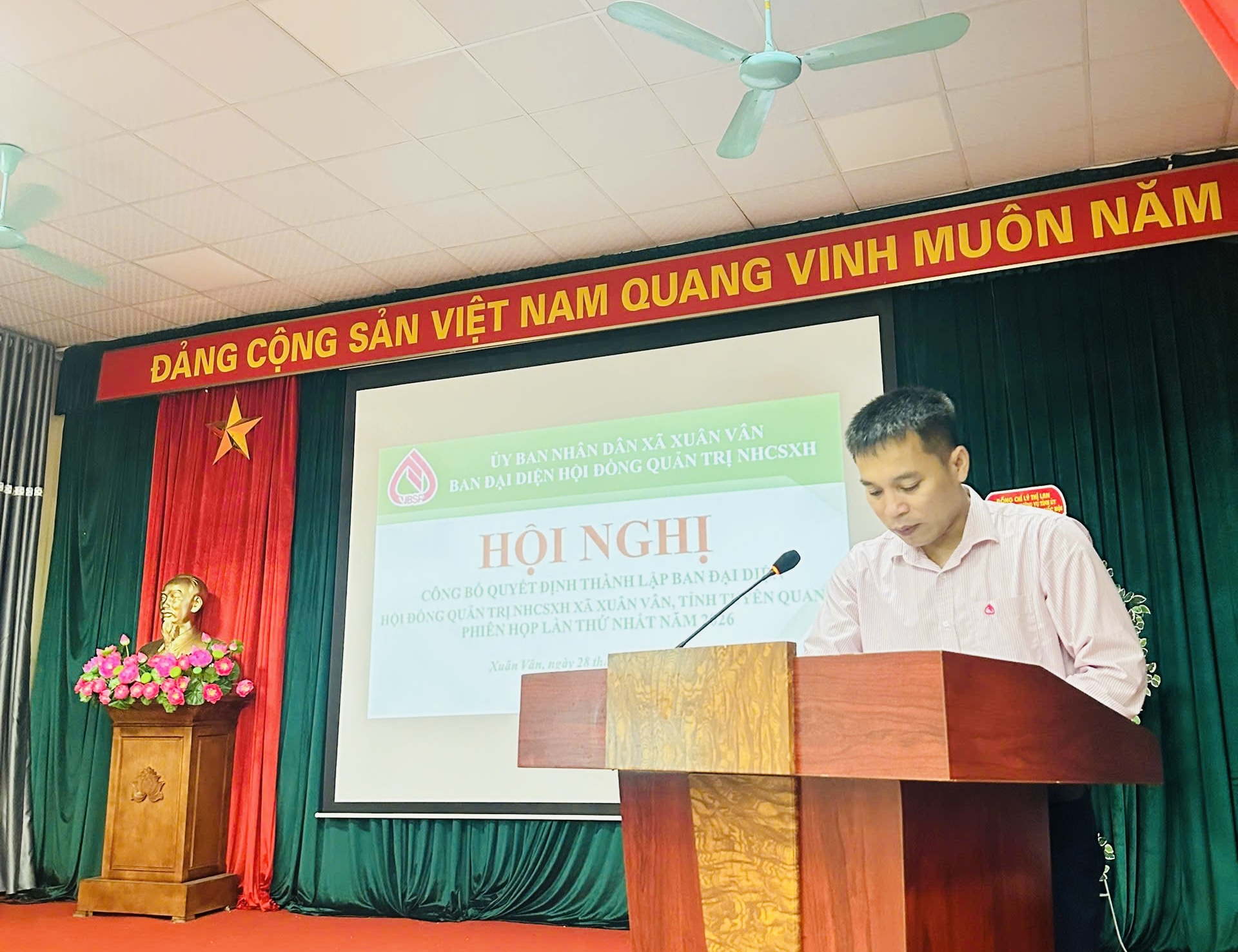 Tại Hội nghị đã công bố Quyết định thành lập Ban đại diện HĐQT NHCSXH xã Xuân Vân. Việc thành lập Ban đại diện nhằm tăng cường công tác lãnh đạo, chỉ đạo và giám sát việc thực hiện các chương trình tín dụng chính sách trên địa bàn; bảo đảm nguồn vốn ưu đãi của Nhà nước được triển khai kịp thời, đúng đối tượng thụ hưởng, góp phần hỗ trợ hộ nghèo và các đối tượng chính sách phát triển sản xuất, nâng cao thu nhập, thực hiện hiệu quả mục tiêu giảm nghèo bền vững, đảm bảo an sinh xã hội và thúc đẩy phát triển kinh tế - xã hội tại địa phương.