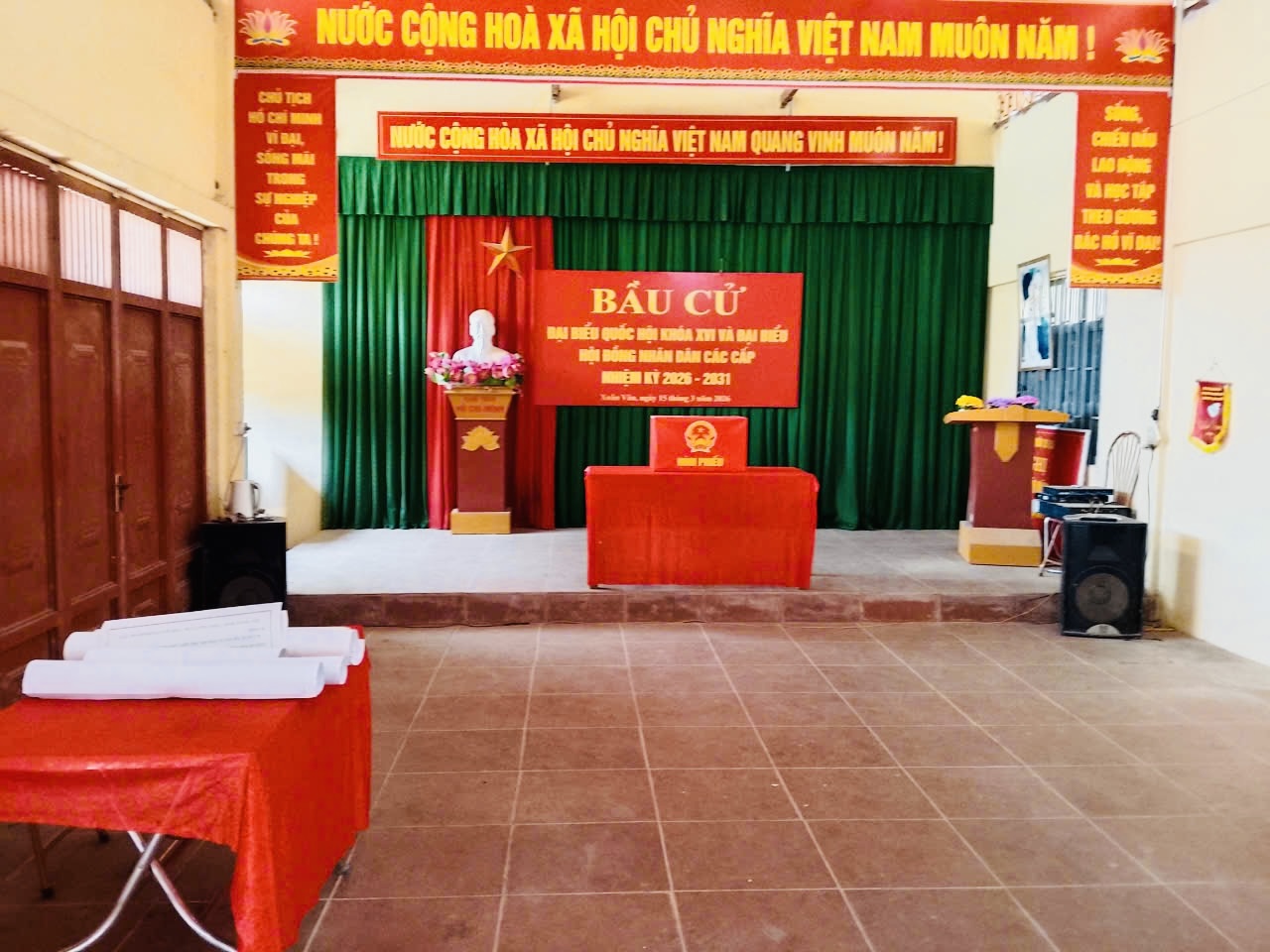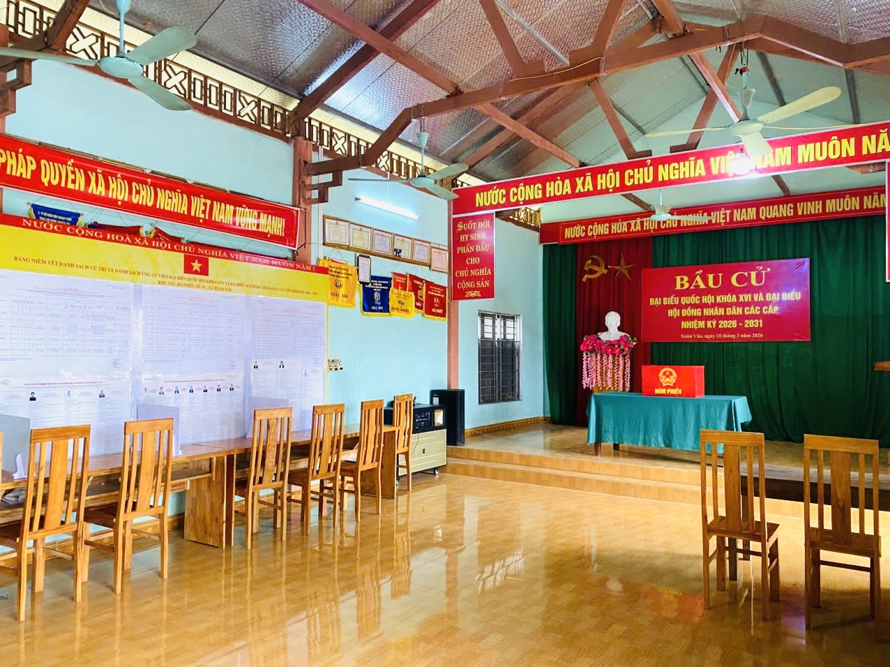 Tại các nhà văn hóa thôn, khu vực bỏ phiếu đã được trang trí trang nghiêm với cờ Tổ quốc, băng rôn, khẩu hiệu. Hòm phiếu, bàn hướng dẫn cử tri và các điều kiện phục vụ bầu cử được chuẩn bị đầy đủ, sẵn sàng phục vụ Nhân dân tham gia ngày hội lớn của địa phương.